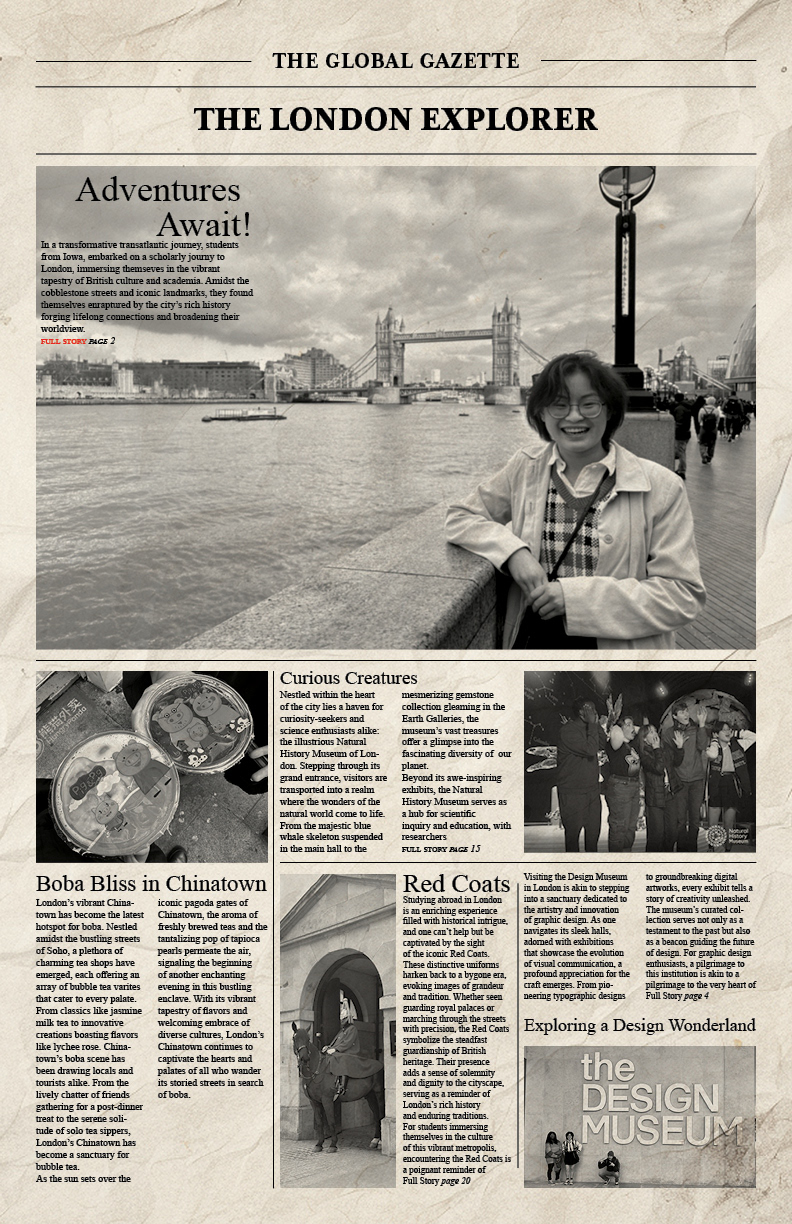 I designed and created a fake newspaper inspired by my study abroad experience in London. Seeing all the newspapers scattered around the city, I felt compelled to craft my own, documenting my journey studying abroad